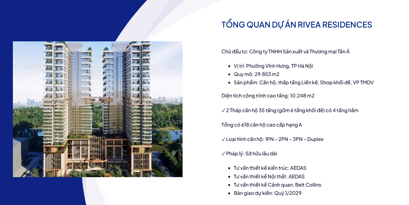 Rivea Residences được phát triển bởi Tập đoàn Tân Á Đại Thành, dự án mang đến không gian sống sang trọng hiện đại và tiện nghi. Chủ đầu tư Meyland đã phát triển dự án Rivea Residences cung cấp các sản phẩm đa dạng từ Shophouse đến căn hộ chung cư, cùng hệ thống tiện ích phong phú. Rivea Hanoi Residences hứa hẹn mang đến cuộc sống đẳng cấp và thoải mái cho cư dân.