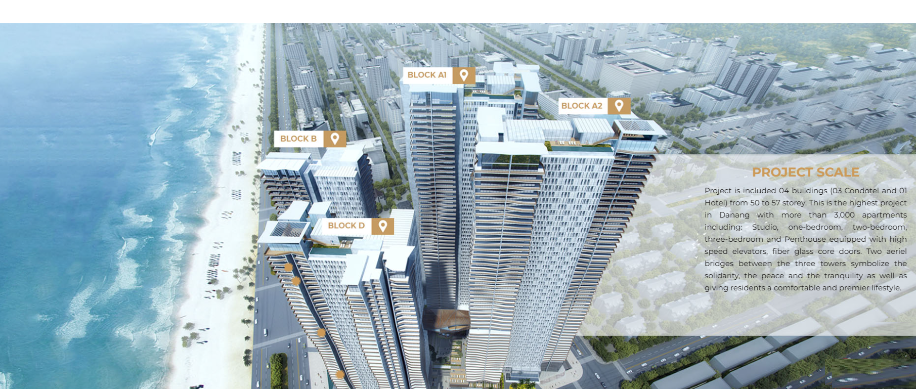Đây là dự án cao nhất Đà Nẵng, hơn 3.000 căn hộ từ loại Studio, 01 đến 03 phòng ngủ và penthouse, được trang bị thang máy tốc độ cao, hệ thống cửa kính lõi sợi thủy tinh có sức bền với thời gian và đảm bảo sức khỏe. Chia sẻ:
