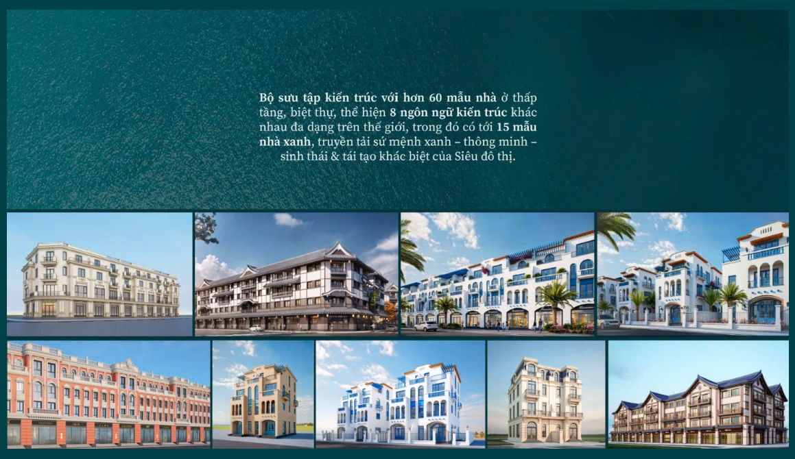 Bộ sưu tập kiến trúc với hơn 60 mẫu nhà ở thấp tầng, biệt thự, thể hiện 8 ngôn ngữ kiến trúc khác nhau đa dạng trên thế giới, trong đó có tới 15 mẫu nhà xanh, truyền tải sứ mệnh xanh – thông minh – sinh thái & tái tạo khác biệt của Siêu đô thị.