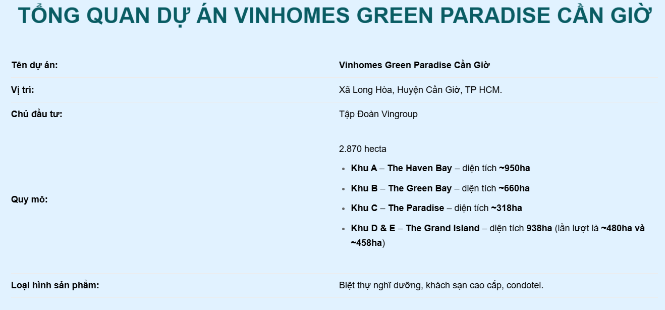 Dự án Vinhomes Green Paradise Cần Giờ chắc chắn sẽ là một lựa chọn tuyệt vời cho các nhà đầu tư, kinh doanh cũng như đáp ứng nhu cầu nghỉ dưỡng sang trọng bậc nhất cho khách du lịch.