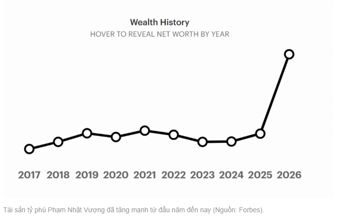 Sự thăng hoa của nhóm cổ phiếu họ Vingroup đã đưa tài sản tỷ phú Phạm Nhật Vượng lên vị trí 77 trong bảng xếp hạng người giàu nhất hành tinh. Theo cập nhật thời gian thực của Forbes, tài sản Chủ tịch Vingroup vào rạng sáng nay (17/4) là 30,9 tỷ USD, tăng 1,7 tỷ USD so với hôm qua. So với cuối năm 2025, khối tài sản vị này đã gấp 4,75 lần.